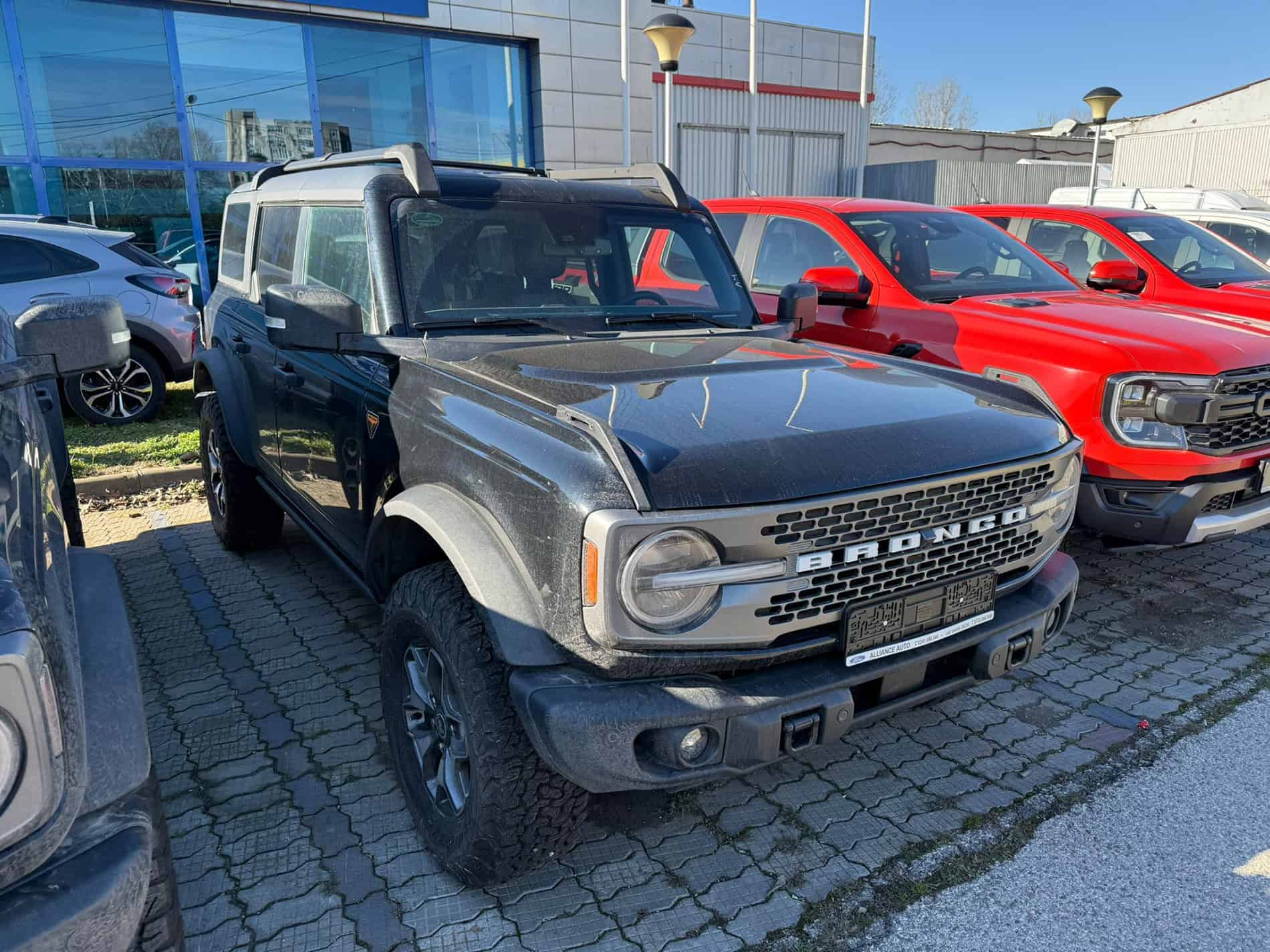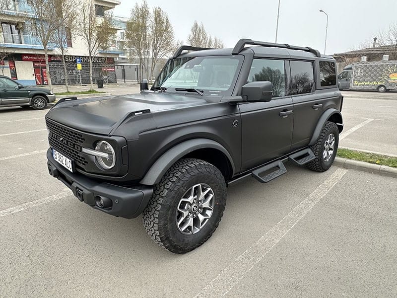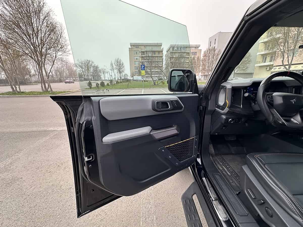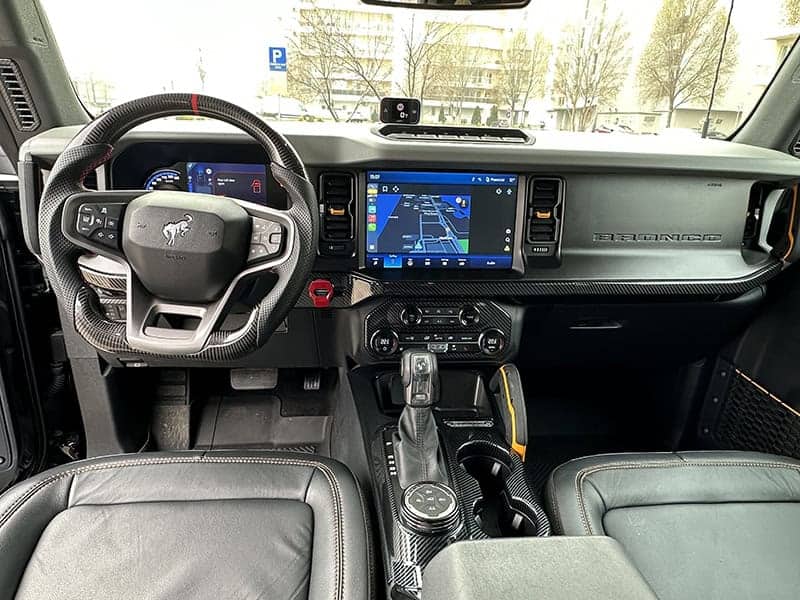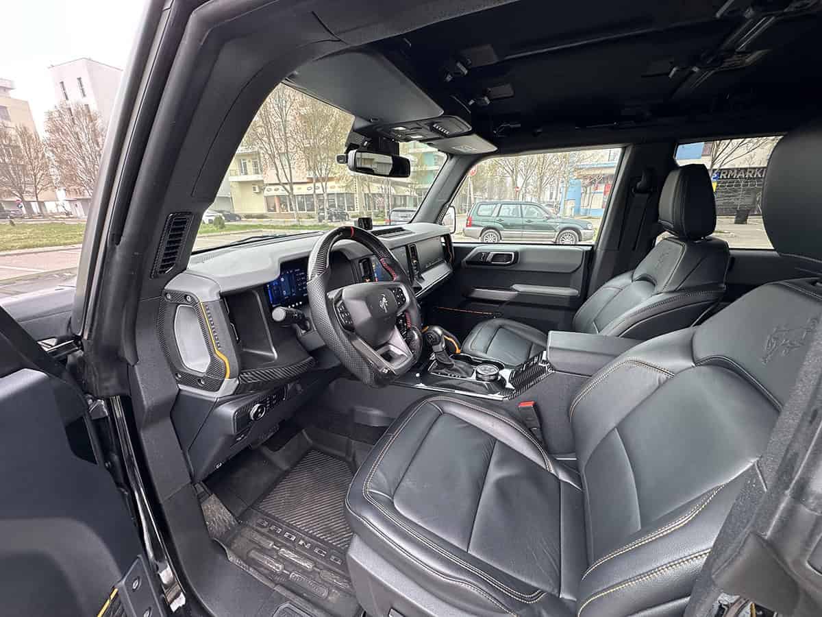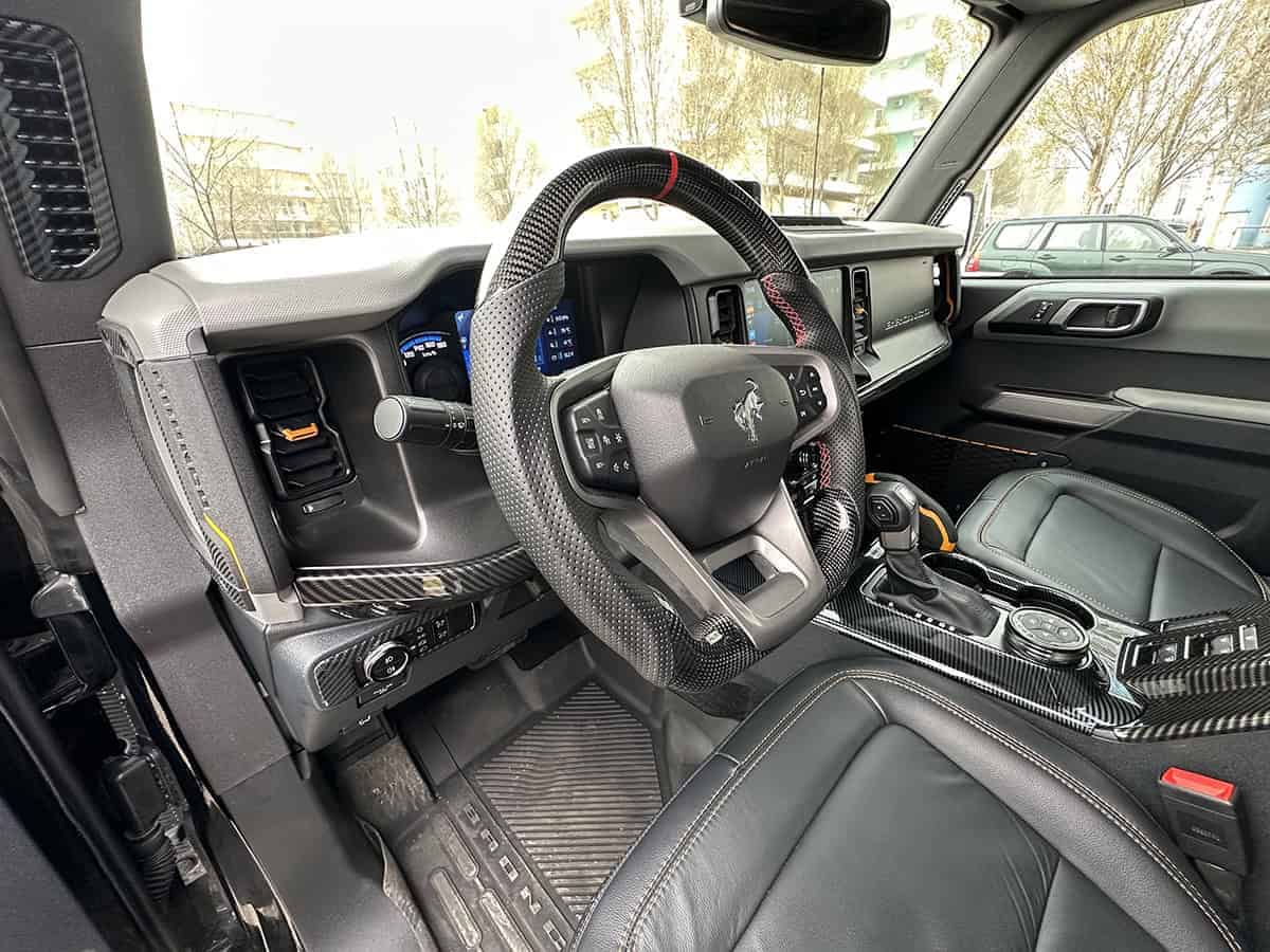This customized Badlands edition stands out with a complete package of upgrades that enhance both style and performance. The body, finished in Absolute Black metallic paint, is protected by a matte PPF film, offering a refined contrast and added durability for off-road adventures. The sound is redefined by the Corsa Performance Cat-Back exhaust with a Magnaflow muffler, while the ROUSCH sport air filter and Blow Off Valve Adapter improve engine responsiveness. Inside, the cabin gains a premium feel with carbon fiber trim and glossy black accents, complemented by smart additions like the Mishimoto Oil Catch Can system and soft Bimini mesh sunshade. The Ford rooftop tent, Coverking soft cover, storage bags, and Bronco-branded spare wheel cover complete this one-of-a-kind version – a perfect blend of functionality and bold visual presence.